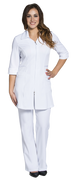 Joanne Martin uniform tunics, made from a blend of Pro-Flex fabric (94% polyester, 6% stretch) and treated to be anti-static and anti-stain, are perfect for professional staff uniforms in hospitality, medical, and spa fields. These tunics feature a V-neck collar, short sleeves, two front pockets with crystal-accented flaps, a two-way zipper, and side slits.